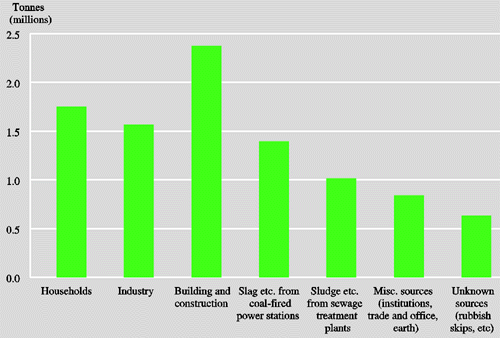 Figure 2.7 Waste production in Denmark in 1993 apportioned according to source (total 9.6 million tonnes)