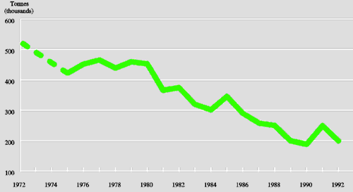 Figure 6.1 Danish emissions of SO2 (1972-92)