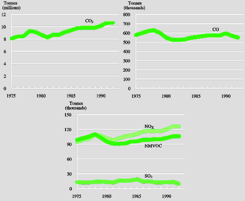 Figure 6.6 Air pollution traffic emissions of CO2, CO, NOx, NMVOC and SO2 (1975-92)