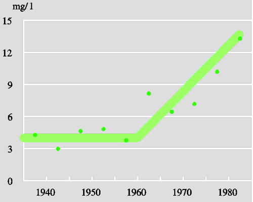 Figure 8.2 Trend in groundwater nitrate content in Denmark (1940-84)