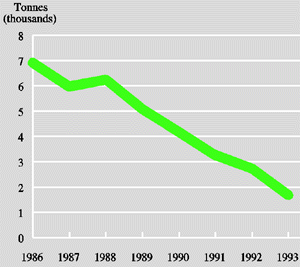 Figure 9.4 ODP-weighted consumption of ozone-depleting compounds (1986-93)