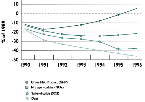 Pollutant emission changes in 1989 to 1996 against the GNP (in percentage of 1989 figures) Agenda 21 in Poland, Progress Report 1992-98, MoE, 1998 Geothermal energy causes almost no pollution in terms of particulate matter, sulphur dioxide, nitrogen oxides or aromatic hydrocarbons. Moreover, geothermal energy provides an additional advantage stemming from the fact that it produces almost no carbon oxide. In other words, there are plenty of environmentally sensible reasons to support the development of geothermal resources. A better air quality Even though Poland still relies mainly on the use of coal and coke in its energy production, the emissions of the main air pollutants, sulphur dioxide, nitrogen oxide and particulates, are actually declining or stabilising according to the balances for the period up to 1997. Initially, the decrease in pollutant emission was a result of the economic recession, where the steady increase in GNP since 1992 has been accompanied by continued reductions in the total pollutant emissions. Waste water treatment and gypsum handling at Dolna Odra Power PlantThe dependence on coal has lead to serious air pollution problems in Poland but the coal-fired power plants are also a major potential air pollution source. DANCEE has supported a number of projects at the Dolna Odra Power Plant with the overall objective to reduce the air pollution from the existing power plants. Today, nearly 80 per cent of the energy used in district heating is generated by coal and cokefired power plants - electric power generation is almost entirely based on coal. The effect of coal burning on the pollution of the air and water is well known, and extensively documented. The problems arise when the sulphur and nitrogen oxides, formed during coal combustion, react in moist air to form sulphuric and nitric acids. These acids, which are spread with the rain, damage the environment and the nature. The Dolna Odra Power Plant Complex is situated in the north-western part of Poland, 35 kms south of the city of Szczecin near the river Oder and close to the German border. The coal-fired power plant is with its 8x200 MW boiler units one of the largest power plants in Poland and at the same time a major potential source for air pollution close to Denmark. The objective: The overall objective of the present project is to reduce the air pollution from the existing power plants. This is going to happen via the establishing of a gypsum handling system and a waste water treatment plant in connection with the extension of a flue gas desulphurisation system (FGD). The procedure: The gypsum handling technology is specifically Danish know-how and this project consists of a complete modern plant to handle gypsum of a saleable quality. As an added value to the environmental advantages this technology will also create a new field of export potential to for instance the cement industry in Sweden or Germany. The waste water treatment plant project comprises a plant for complete purification of the waste water produced in the FGD plant. The plant is designed for two FGD plants for totally 4x200 MW boilers. The maximum gypsum produced for four boiler units is approximately 22 tonnes per hour corresponding to 160 - 180,000 t/year. In the waste water treatment plant the heavy metals are precipitated by means of chemicals. In this process the pH-value is adjusted to the optimum value for precipitating heavy metals and later the purified water is discharged to the recipients. The system further separates the solids from the liquid by means of centrifuges. The filter cake consists of 96 per cent gypsum, while approximately 4 per cent is fly ash containing heavy metals. This filter cake will be returned to the boilers with the coal and hereafter primarily entrapped in the boiler slag and the fly ash. The heavy metals are here entrapped to such an extent that the slag and fly ash can be used as for instance road filler without danger to the groundwater.
