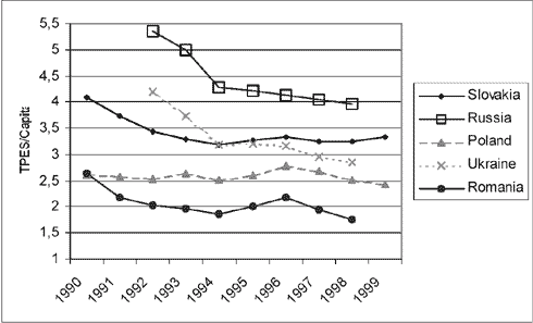 Figure 7.2-2 Source: IEA, International Energy Agency Figure 7.2-2 shows that concerning annual energy supply per capita, Russia is placed in the top end and Romania at the bottom. In relation to figure 7.2-1, it is interesting to note that Poland turns out to have the second lowest energy supply per capita of the five focus countries. It is also important to note that a high national energy supply can be caused by a high energy consumption, as well as by a poor technological state of the 'energy system'. From figure 7.2-5 (energy efficiency) an indication of the technological stage on an aggregated level is given.