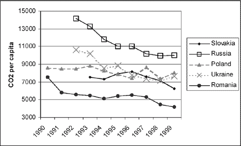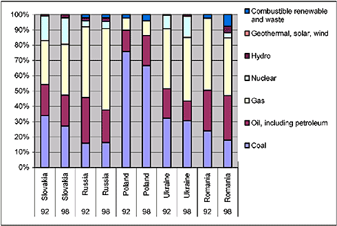 http://fossil.energy.gov/international/romnover.html When looking at the five focus countries in figure 7.2-1, three clusters can be identified; Poland as one cluster in the high end, Romania, Ukraine and Russia placed close together in a cluster in the middle range, and then finally Slovakia placed significantly lower than the other countries. Based on figure 7.2-1 alone, it is not possible to determine what causes this difference in CO2 saving potential between the countries in question. It can either be due to a relative high/low level of CO2 emissions per used energy unit or to a high/low level of energy use (TPES). Therefore, a closer look at the energy use and its composition will give a better insight in this issue.