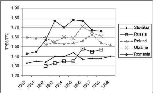 Figure 7.2-5 Source: IEA, International Energy Agency From figure 7.2-5 it is seen that the most energy efficient country is Slovakia - also being the smallest country with the biggest share of nuclear energy. Romania and Ukraine are categorized as being the most energy inefficient of the countries - in both countries it is characteristic that the energy distribution network is of very poor quality. Among non focus countries, it should be mentioned that both Lithuania and Bulgaria experienced a worsening in energy efficiency throughout the decade of the 1990s, leaving both countries at an energy efficiency ratio of about 2.0 in 1998, or significantly higher than the focus countries. In comparison, the 1998-figure for Denmark was 1.3 while for the European Union countries as a whole the average value in 1998 was 1.4. Energy Supply vs. Economic Growth The current transition process in the CEECs, creating expectations of strong economic rebounds from these countries, increases the attention on the coupling between the economy (GDP) and the energy use - the energy intensity. The more energy intense a country is, the stronger incentives there should be to implement technologies and energy forms that will reduce negative environmental effects from expected increases in energy use. Although, it should be kept in mind that for the CEECs, part of the energy structure is determined by the national industrial structures and therefore also subject to other policy decisions and considerations. Ukraine is, according to figure 7.2-6, by far the most energy intensive among the five focus countries. Poland is together with Slovakia placed as the least energy intensive countries. Russia and Romania are also placed much lower than Ukraine, but at a significant higher level than Poland and Slovakia.