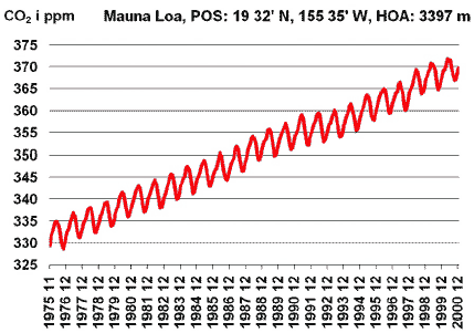 Indicator 4.1: This indicator elucidates developments pertaining to the atmospheric content of greenhouse gases. The figure shows monthly average values for the atmospheric content of CO2, measured on Hawaii. The unit used is ppm (parts per million). The seasonal variations in CO2 content are caused by CO2 being bound in plants in the northern hemisphere during summer, and by CO2 being released when plants rot. The general increase in the concentration of CO2 is greater than the annual fluctuations. The general increase in CO2 concentrations is mainly the result of combustion of fossil fuels. The figure illustrates how CO2 emissions are still too large in relation to the sequestration of CO2 in oceans and the biosphere. As a result, atmospheric content has increased. The 1992 UN Climate Convention, IPCC, demands that the atmospheric content of greenhouse gases must in the long term be stabilised at a level sufficiently low to prevent hazardous anthropogenic impacts on the climate. The IPCC indicates that this may require that emissions be reduced by 50 to 70 per cent. On this basis, the objective in the EU is that concentrations of greenhouse gases in the atmosphere be stabilised at a level equal to just under double the concentrations seen before industrialisation. This corresponds to a scenario where emissions from industrial countries are reduced by 10-15 per cent in relation to presentday emissions before the turn of this century. Implementation of the 1997 Kyoto Protocol will only lead to a reduction in emissions from industrialised countries of 5 per cent in 2008-12 compared to 1990 levels. This applies to six greenhouse gases (CO2, CH4, N2O, CFCs, HFCs, and SF6). Denmark's total reduction of 21 per cent corresponds to approximately 15 million tonnes of greenhouse gases, which accounts for more than 1.5 per cent of the total Kyoto reduction measured in tonnes.