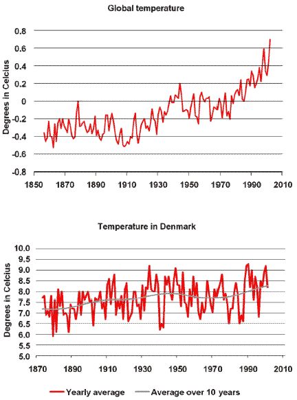 Indicator 4.2: This indicator elucidates the speed and extent of climate change. The long-term development in average temperatures near ground level globally and in Denmark are very much alike, but the increase is slightly higher in Denmark compared to global levels. In all likelihood, most of the increase seen after circa 1970 is caused by human impact on the climate. It can be difficult to distinguish between a general increase in temperatures caused by human influence and one occurring due to natural processes. A long period of temperature studies is required in order to unambiguously identify the anthropogenic impact on the climate. Despite the great variations in temperature measurements, the different types of measurements correspond well with each other. The figures illustrate how the anthropogenic greenhouse effect is very likely to have affected long-term temperature developments. On top of human influences, we see variations caused by the chaotic nature of the climate or by natural impacts (volcanoes, solar variations, etc.).