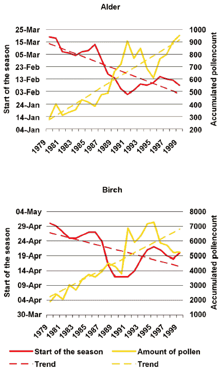 Indicator 4.3: This indicator illustrates the effects of climate change in Denmark, as indicated by the beginning of the pollen season. The figure shows that the pollen season has changed significantly since pollen counts began in 1977. The season starts earlier, and the quantities of pollen have increased. The greatest change in terms of the beginning of the season concerns early pollen from alder, from around 16 March to late January. The change for birch is somewhat more modest - from around 28 April to 16 April. The reason for these shifts towards earlier pollen seasons is that the weather has been significantly warmer in recent years than when the pollen counts began, particularly during spring. The annual amount of pollen (the sum of the daily pollen counts) shows that the amounts have increased significantly - generally speaking with a factor of 2 to 3 during the period. The general increase can be one explanation of many for the observed increase in the number of people who are allergic to pollen. The greater quantities of pollen may be partly caused by the increase in temperatures during the period, as higher temperatures usually lead to better growth conditions.