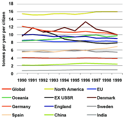 Indicator 4.4: This indictor shows what countries have special obligations due to their high emissions of CO2. The figure shows developments in CO2 emissions per capita for selected countries and regions, as analysed by the International Energy Agency. The development in Denmark is obscured by major fluctuations in the electricity sector. When corrected for these fluctuations, the net result is a 12 per cent reduction during the period (according to an analysis prepared by the Danish Energy Authority). The total emissions showed large increases in e.g. China (+25.6 per cent), India (+52.9 per cent), and the OECD (+10.3 per cent). For the industrialised countries, including Eastern Europe, we see a modest drop in total emissions of 1.4 per cent. For the EU as a whole, we see a drop of 3.7 per cent, which covers vast differences, e.g. a growth of 26.8 per cent in Spain and of 52.1 per cent in Portugal, while Germany saw a reduction of 17.8 per cent and the UK saw a fall of 9.5 per cent. For the world as a whole, we see a reduction of 4.2 per cent. This figure covers an increase in the total emissions of 8.9 per cent and a population increase of 13.7 per cent. This development illustrates that CO2 emissions, particularly within developing countries, are far from being stable, and are even further away from beginning to fall. A fall is required in order to stabilise atmospheric contents. There is a slight decrease in CO2 emissions from industrialised countries. This decrease does, however, encompass vast national differences.
