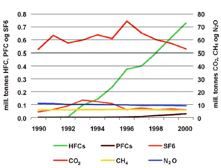 Indicator 4.5: This indicator illustrates developments in relation to Denmark's contribution to the Kyoto Protocol. The indicator shows Denmark's emissions of greenhouse gases 1990-2000 in total and by each of the six green house gasses included in the scope of the Kyoto Protocol. Denmark's base year under the Kyoto Protocol comprises the 1990 emissions of CO2, N2O, and CH4 as well as the 1995 emissions of HFCs, PFCs, and SF6. This indicator does not extend to Greenland and the Faeroe Islands. In 2000 the total emissions corresponded to 1990 levels after having peaked in 1996. The increase up until 1996 was partly due to the growing electricity production for export, which also peaked in 1996. The subsequent reduction has mainly been caused by the reduced export of electricity and by the increased use of natural gas and renewable energy instead of oil. Developments in relation to Denmark's international goals for reducing emissions of greenhouse gases are described under Indicator 4.8.