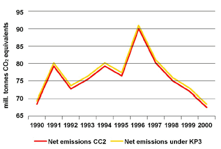 Indicator 4.8: This indicator illustrates developments in relation to Denmark's contribution to the Kyoto Protocol. Denmark's base year under the Kyoto Protocol comprises the 1990 emissions of CO2, N2O, and CH4 as well as the 1995 emissions of HFCs, PFCs, and SF6. The total emissions and sequestration must be reported under the Climate Convention. Under the Kyoto Protocol, the total emissions must be included in analyses, whereas only part of the CO2 sequestration included. This indicator shows Denmark's net emissions of greenhouse gases 1990-2000 - i.e. emissions less sequestration - as it must be reported to the Climate Convention, including the total sequestration, and as it must be calculated under the Kyoto Protocol, i.e. including only sequestration in new forest established since 1990. This indicator does not extend to Greenland and the Faeroe Islands. In 2000 the net emissions corresponded to 1990 levels after having peaked in 1996. The increase up until 1996 was partly due to the growing electricity production for export, which also peaked in 1996. The subsequent reduction has mainly been caused by the reduced export of electricity and by the increased use of natural gas and renewable energy instead of oil. As the net emissions in 2000 corresponded to the net emissions in 1990, Denmark has met the Climate Convention objective which stipulates that the countries should trace back the emission level in 2000 to the level in 1990. When applying the methods of analysis used under the Kyoto Protocol, Denmark had achieved a reduction of almost 2 per cent in 2000 since the base year. As Denmark's objective under the Kyoto Protocol will be a reduction of 21 per cent up until the period 2008-2012, this leaves a reduction of approximately 19 per cent which still needs to be achieved compared to the emissions in 2000.