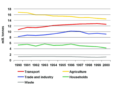 Indicator 4.9: This indicator shows Denmark's emissions of greenhouse gases during the period 1990 to 2000, both in total and by sector. The distribution by sector corresponds to the one used in "Climate 2012", the Ministry of Energy and Environment, March 2001. Denmark's base year under the Kyoto Protocol comprises the 1990 emissions of CO2, N2O, and CH4 as well the 1995 emissions of HFCs, PFCs, and SF6. This indicator does not extend to Greenland and the Faeroe Islands. In 2000 the total emissions corresponded to 1990 levels after having peaked in 1996. Emissions from the transport sector grew by almost 18 per cent. Emissions from agriculture fell by approximately 14 per cent, which is mainly due to the implementation of the Action Plans for the Aquatic Environment. These plans served to reduce nitrogen emissions, thereby also reducing nitrous oxide (laughing-gas) emissions. Emissions from the commercial sector have increased by almost 7 per cent, which is partly due to greater energy consumption, and partly due to the increasing use of HFCs as a cooling agent as an alternative to cooling agents which degrade the ozone layer. Emissions from households are down by approximately 19 per cent, which is mainly due to more efficient energy consumption and to the fact that consumers change from individual heating systems which use oil to systems which use natural gas, or to district heating. Emissions from the waste sector, which in this context extends only to methane emissions from landfills, are down by almost 9 per cent. This is mainly due to the 1997 ban on depositing degradable waste and to the increasing collection of methane from landfills for energy purposes. The objective is to incorporate all reduction opportunities for greenhouse gases in the most cost-effective manner possible. As the figure shows, only the emissions from the transport sector and the commercial sector have not been reduced.