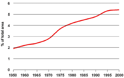 Indicator 14.1: This indicator elucidates developments in land use for urban development. The figure illustrates urban development since 1950 as a percentage of Denmark's total area. In the last 50 years, urban areas have tripled or quadrupled in size. Since 1974, an area the size of Bornholm has become designated as urban zone. Even so, urban zones account for a relatively modest percentage of Denmark's total area: 6 per cent all in all. The growing urbanisation has entailed increased focus on local authority area planning with regard to a number of significant functions, e.g. use for dwellings, businesses, and service functions.