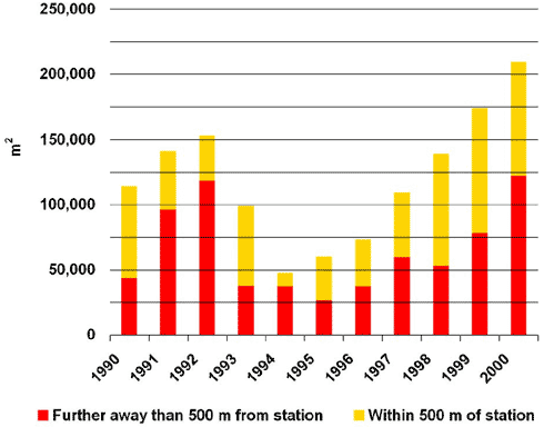 Indicator 14.2: This indicator illustrates the interplay between urban structures and the overall transport system. The figure demonstrates developments in the extent of recently constructed office facilities located near stations. Since 1989, the Greater Copenhagen area has aimed to have new buildings with office and service facilities located within a distance of no more than 1,000 metres from particularly well-serviced S-train stations or 500 metres from other, centrally located stations. The curve shows that in spite of this objective, around half of all new office buildings are still being located in sites that are not close to stations. In fact, the trend in the late 1990s is for 80 per cent of such office facilities to be located far away from stations in the local authorities surrounding the main city of Copenhagen. This development means that it is becoming increasingly difficult to contribute to ensuring that commuter traffic is carried out by means of public transport, thereby reducing car transport and dependence on cars. Ensuring integrated area and transport planning is a central objective in Copenhagen, but also in other major cities such as Stockholm and Amsterdam.