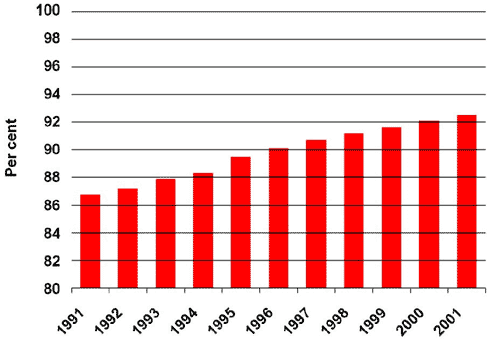 Indicator 14.3: This indicator elucidates the quality and utility value of buildings. The number of dwellings without any installation shortcomings (i.e. dwellings which have district heating/central heating and in-house bath/shower and toilet facilities) constitutes 92 per cent of the total housing stock, which numbers 2.5 million dwellings. This means that dwellings with installation shortcomings account for 8 per cent of total housing stock. The most frequent shortage concerns bath facilities. A total of 6 per cent of all dwellings do not have their own bath or shower facilities, corresponding to 161,000 dwellings. During the last ten years, the technical standard of the housing stock has improved significantly due to new construction work, modernisation, urban renewal, and demolition of the poorest dwellings. Since 1991, the number of dwellings with faulty or without installations/facilities has been reduced from 315,000 dwellings to 188,500 dwellings in 2001. Compared to other countries, the technical standard of the Danish housing stock is very good - particularly because 98 per cent of the housing stock has proper heating supply.