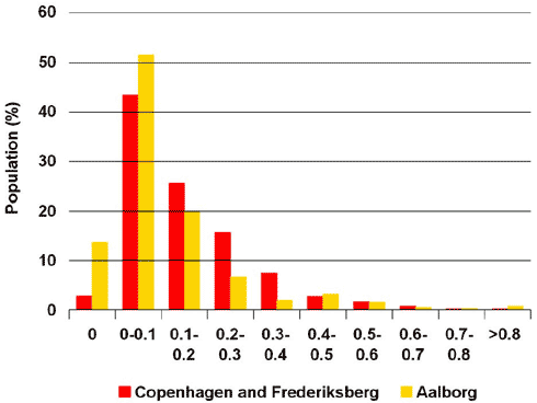 Indicator 14.4: This indicator elucidates the recreational opportunities offered by cities. Having green areas within easy distance is important to recreation in everyday life. Studies show that if you do not have a green area within a distance of 500 metres from your home, you will not use it in the course of your everyday life. The extent of green areas available per capita varies greatly in the Danish towns and cities. A city like Aalborg has ten times more green areas per capita than Copenhagen. This is because Aalborg has large green areas on the outskirts of the city. Having said that, the figure also shows that the inhabitants of Copenhagen have access to more large green areas by percentage than is the case in Aalborg. If the quality of urban recreation is to be improved, it is important to continue to ensure recreational opportunities in connection with urban renewal and development. Conversions of old commercial areas, urban renewal, etc., offer scope for improving green aspects of densely built-up urban areas.