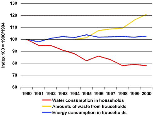 Indicator 14.6: This indicator elucidates resource consumption in dwellings. The figure shows indices for household water consumption from 1990 to 2000 and waste volumes 1994 to 2000 in thousand tonnes. There has been a marked decrease in household drinking water consumption. Among other things, this should be seen in light of the fact that the 1993 tax reform included a water tax of DKK 1 per m3 in 1994, which gradually grew to DKK 5 per m3 in 1998. Denmark's water consumption per capita is low compared to other, similar countries. Cf. Vækstvilkår i Danmark from the Danish Ministry of Economic and Business Affairs, May 2002. As can be observed, energy consumption has remained relatively constant throughout a ten-year period. The waste volumes generated by households have increased steadily throughout the period. The increase amounted to 20 per cent, which exceeds the economic growth during the period. Household water consumption has successfully been reduced, and electricity consumption has been stabilised despite increasing wealth. Waste volumes generated by households have, however, gone up.