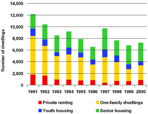 Indicator 14.7: This indicator elucidates the supply of housing. A total of 7,300 rental dwellings were built in 2000. Of these, 900 were private rental dwellings, while 6,400 dwellings were various types of publicly funded housing. In addition to this, 8,000 owneroccupied dwellings were built in 2000 (including cooperative dwellings). In the last ten years, approximately 8,500 rental dwellings have been erected each year, with fluctuations in 1994, 1996, 1997, and 1999. Overall, there has been a decline in building activity within this area. Throughout the period, private rented dwellings accounted for slightly more than 10 per cent. The objective is to secure growth in the supply of housing. The Government will ensure that construction of private rental dwellings resumes. Among other things, this will be done by providing pension funds with better opportunities for building and renting dwellings, including youth accommodation in university cities as well as dwellings for the elderly.