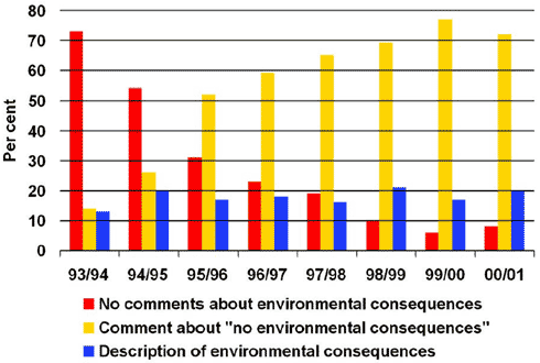 Indicator 15.1: This indicator concerns the objective stipulating that decisions at all levels should be assessed in relation to the environment. The figure provides an overview of the number of legislative proposals which include comments on environmental impacts. The percentage of legislative proposals that include descriptions of environmental consequences has remained stable since the parliamentary session 1994/1995. Thus, comments on environmental impacts were included in approximately 20 per cent of all proposals made during the parliamentary sessions from 1994/1995 to 2000/2001. During the period since 1993, there has been a decrease in the number of legislative proposals that have been passed without comments on their environmental impact. For the parliamentary session 2000/2001, it was 8 per cent. The relative share of legislative proposals that result in the comment "No environmental impacts" has gone up from 14 per cent during the parliamentary session 1993/1994 to 72 per cent during the parliamentary session 2000/2001. The relative incidence of Bills with and without comments on environmental impacts seems to have become stabilised at a level where environmental impacts are assessed for more than 90 per cent of all legislative proposals.