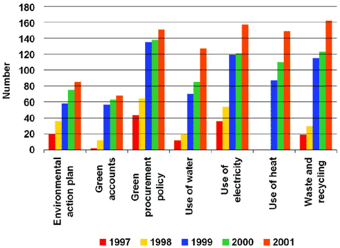 Indicator 15.2: This indicator serves to illustrate public sector inclusion of environmental considerations in their procurement policy. Management of day-to-day activities has an impact on the environment, e.g. via green procurement policies and management of consumption of energy, heat, and water. The data used comprises 47 state institutions in 1997, 69 state institutions in 1998, 165 state institutions in 1999, 166 state institutions in 2000 and 199 state institutions in 2001. In 1997, a total of 47 ministries, agencies, and other state institutions reported environmental initiatives. In 2001, this figure had risen to 199 out of a total of 350 state institutions. Incorporation of all environmental areas has increased from 2000 to 2001. As the number of state institutions included in calculations has increased in relation to last year, the increases regarding environmental efforts cannot, however, be ascribed to a general raising of priority given to this area by the institutions.