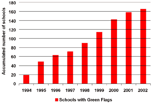 Indicator 15.3: The "Green Flag" campaign is an indicator for environmental teaching in schools. The figure illustrates developments in the number of "Green Flag" schools throughout the last nine years. A "Green Flag" school is a school which has carried out one or more Green Flag activities and which flies a Green Flag as a symbol of their green initiatives. The Green Flag themes are water, energy, waste, nature, and environmental auditing. The graph shows a steady increase in the number of schools participating in the campaign (the 2002 figure was calculated as of 1 May 2002). The number of Green Flags has increased significantly from 19 in 1994 to 165 in 2002. It should be mentioned that not all schools will fly a green flag at any given time. Participating schools receive a flag for each theme completed, and are then allowed to fly the flag for a year. Once this year is up, the requirements associated with a new theme must be met. If these requirements are not successfully met, the flag is taken down. A new flag will be issued when the school meets the new requirements. A steady increase in the number of schools interested in the campaign ties in well with the desire for including green aspects in teaching. Other education schemes also focus on environmental teaching, but the "Green Flag - Green School" scheme is unique in that the whole school takes part in the process. The scheme not only ensures raised levels of awareness and knowledge as well as behavioural changes in the school. It also affects real resource savings at participating schools. Continued increases in participation in the "Green Flag" scheme would be most satisfactory.