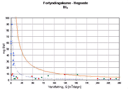 stigende vandføring op til den teoretiske fortyndingskurve for 27 PE. De målte