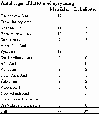 Kilde: Finansstyrelsen. Der blev gennemsnitligt disponeret 0,9 mill. kr. pr. matrikel til oprydning og undersøgelse i 1998. De gennemsnitlige udbetalinger var i samme periode 0,7 mill. kr. pr. matrikel til oprydning og undersøgelse. Der blev således disponeret mere pr. sag end der var behov for, hvilket var medvirkende til, at der var en stor tilbageførsel af midler på i alt 20,3 mill. kr. i 1998 fra tilsagn, der helt eller delvist bortfaldt. Tabel 6.2: Amtsvis fordeling af værditabsoprydninger i 1998 på hhv.matrikler og forurenede lokaliteter.