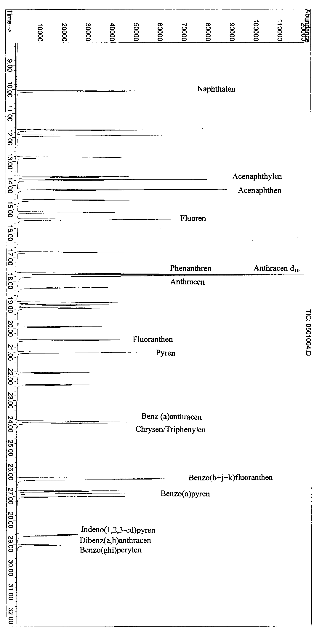 GC-MS-kromatogram af PAH-standarder med markering af de 16 (18) EPA PAH-forbindelser. |