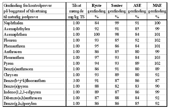 Tabel 3.2.7a Gennemsnitlig genfinding fra kontrolprøver for de forskellige metoder