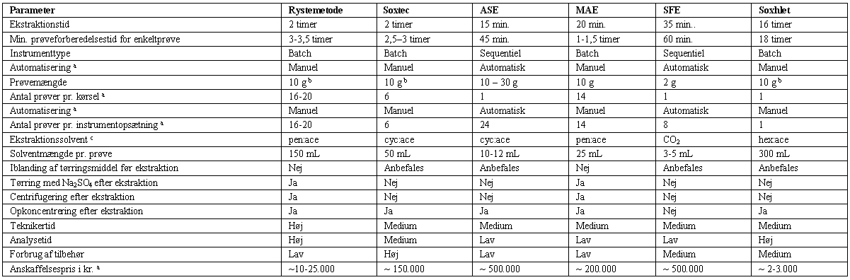 ![]() a Afhænger af instrumenttype og -version. Prisen er desuden afhængig af rabatordninger og valutakurser.b Det er sandsynligt, at der vil kunne benyttes større prøvemængder, men det er ikke verificeret i denne undersøgelse. c Alle solventblandinger er i forholdet 1:1; de brugte forkortelser er: pen = pentan, cyc = cyclohexan, hex = n-hexan og ace = acetone. |