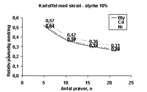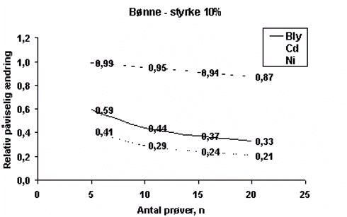 Figur B.5.6 Figur B.5.6 viser, at en fordobling af prøveantallet fra 5 til 10 vil formindske den forskel i middelværdi, der vil kunne påvises for alle afgrøder og alle metaller med undtagelse af cadmium i bønne. For radise og kartoffel, hvor formindskelsen er størst, er der tale om, at der med det nuværende datasæt kan skelnes forskelle mellem middelværdier i størrelsesordenen 50% ændring, hvor der ved fordoblet prøveantal vil kunne skelnes ændringer i størrelsesordenen 40%. Den opnåede forbedring er således begrænset til ca. 10%. Middelværdierne fra Overvågningssystemets data er baseret på et større prøveantal, hvorfor dette vil få større betydning for antallet af frihedsgrader og dermed t-testens styrke end prøveantallet fra forsøget. Endvidere er der for de fleste afgrøder og metaller større variation inden for data fra Overvågningssystemet end inden for data fra den enkelte jord i forsøget. Ved sammenligning af middelværdier fra forsøget med middelværdier fra Overvågningssystemet vil variationen inden for datasættet fra sidstnævnte derfor have større betydning for udfaldet af en t-test end antallet af prøver fra forsøget. Der ses således ikke at være dokumentation for, at analyse af flere prøver fra forsøget vil forbedre styrken af de statistiske analyser væsentligt. |