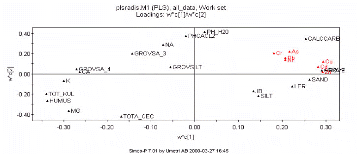 Loading figur for PLS modellen for radise. Symbolerne for metallerne angiver