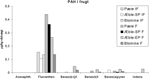 Figur 12.2 Af tabellerne B2.10-B2.16 fremgår det, at en del af analyseresultaterne er under detektionsgrænsen. Værdier for disse er opgivet fra analyselaboratoriet og er indgået i beregningerne. Der er ikke målt hverken indeno(1,2,3-cd)pyren eller acenaphthylen i nogen af prøverne. For acenaphthylen kan forklaringen være analytiske problemer, da detektionsgrænsen var høj, og stoffet kan være fordampet under oplukning af prøverne. Der er målt spor af indeno(1,2,3-cd)pyren i enkelte prøver, og de toppe, der ses i figur 12.1 og 12.2, er under detektionsgrænsen. Denne forbindelse bindes meget hårdt i jord og kan ikke forventes optaget og translokeret i planter. I grøntsagsundersøgelsen (afsnit 8.6) blev den kun målt i prøver fra forurenede parceller af rodfrugter med skræl, der havde været i tæt kontakt med jorden gennem hele vækstsæsonen. Der foreligger ikke oplysninger om andre kilder til PAH-forbindelser i de pågældende frugter og bær. For eksempel er eventuel tilstedeværelse af skorstene fra brændovne og/eller røgovne ikke kendt, og det kan ikke udelukkes, at de konstaterede spor af indeno(1,2,3-cd)pyren i enkelte prøver kan stamme fra sådanne kilder. Niveauerne af de øvrige PAH-forbindelser (fluoranthen, benzo(b+j)fluoranthen, benzo(k)fluoranthen og benzo(a)pyren) er generelt lave sammenlignet med grøntsagerne. F.eks. lå middelværdierne for benzo(a)pyren i grøntsager fra den stærkt forurenede jord i intervallet 0,046-3 µg/kg vådvægt, mens det tilsvarende interval for frugter og bær fra forurenet jord var <0,018-0,045. Der er ikke en entydig sammenhæng mellem målt indhold i frugterne og jordens forureningsgrad om end der er tendens til, at niveauerne er lavest i prøver fra ikke-forurenede grunde. 12.1 Æble, pære, blomme og hyben12.1.1 SamleprøverI æble, pære og blomme (figur 12.1) samt hyben er de målte PAH-koncentrationer generelt lavere end i stikkelsbær med undtagelse af fluoranthen, der er målt i de fleste prøver af de fire frugter i niveauer fra 0,03 til 0,9 µg/kg. I en enkelt hybenprøve fra forurenet jord er der dog målt 8,2 µg/kg. (Hyben er ikke medtaget på figur 12.1 og 12.2, da det høje fluoranthen-niveau ville forrykke ordinaten, så resultaterne fra de øvrige PAH-forbindelser ikke ville kunne skelnes.). Benzo(b+j+k)flouranthen er målt i de fleste prøver af blomme, pære og hyben med maksimum på 0,04 µg/kg. Benzo(a)pyren (detektionsgrænse 0,018 µg/kg) er ikke konstateret i prøver af pære og blomme fra ikke-forurenede grunde, mens den er konstateret eller målt (0,02 µg/kg) i enkelte prøver fra forurenede grunde. I æble er der ikke konstateret spor af benzo(a)pyren i tre ud af fire samleprøver fra forurenede grunde, men i begge de to prøver fra ikke-forurenede grunde (0,02 µg/kg i alle tre prøver, hvor det er målt). I en enkelt hyben-prøve fra forurenet jord er der målt 0,05 µg/kg, mens benzo(a)pyren ikke kunne konstateres i de øvrige hybenprøver. 12.1.2 Enkeltprøver af æbleDer blev analyseret et antal enkeltprøver af æble for at få belyst, hvorvidt der i samleprøver med ikke-måleligt indhold af PAH-forbindelser (specielt benzo(a)pyren) indgik enkelte prøver med målelige koncentrationer. Til analyser af enkeltprøver af æble blev der valgt æbler fra de to samleprøver fra de mest forurenede grunde. Der blev generelt fundet god overensstemmelse mellem niveauerne, fundet i samleprøver og i enkeltprøver (tabelB2.10-B2.11), omend der i enkeltprøverne blev fundet benzo(b+k+j)fluoranthen i lave koncentrationer, hvor disse forbindelser ikke havde kunnet måles i samleprøverne. En af enkeltprøverne, der indgik i samleprøve 2, havde et noget forhøjet indhold af samtlige målelige PAH-forbindelser. For benzo(a)pyren var det dog ikke så meget, at middelværdien af enkeltprøverne fra den pågældende samleprøve (nr. 1 i tabel B2.10) oversteg værdien for den oprindeligt analyserede samleprøve. I æble sås der således ingen korrelation mellem koncentrationer af PAH-forbindelser i jorden og i frugterne. Den højeste koncentration af benzo(a)pyren (0,02 µg/kg) var fundet i to samleprøver fra ikke-forurenede grunde samt i samleprøven fra de mest forurenede grunde. Enkeltprøverne viste derimod de højeste koncentrationer af benzo(a)pyren (ca. 0,1 µg/kg) i en prøve fra jord med 7 mg/kg, mens prøver fra jord med ca. 10-14 mg/kg lå på 0,01 µg/kg. 12.2 StikkelsbærI stikkelsbær var indholdet af PAH-forbindelser generelt højere end i de øvrige frugter. Her blev der målt højere indhold af fluoranthen, benzo(b)- samt benzo(j+k)-fluoranthen og benzo(a)pyren i to af prøverne fra forurenede grunde. I den første analyseserie af stikkelsbær indgik 5 samleprøver og en enkeltprøve. Sidstnævnte stammede fra den mest forurenede grund, der var stærkt forurenet både i overfladen (sum-PAH op til 425 mg/kg) og i en halv meters dybde (op til 161 mg/kg). De højeste koncentrationer blev målt i enkeltprøven fra den mest forurenede grund. Benzo(a)pyren-koncentrationen i denne stikkelsbærprøve blev målt til 2,0 µg/kg. De øvrige prøver i denne analyseserie var samleprøver. I prøver fra forurenede grunde var benzo(a)pyren-koncentrationen 0,06-0,75 µg/kg, og der var ikke sammenhæng mellem forureningsniveauet i jord og stikkelsbær. I de to samleprøver fra ikke-forurenede grunde var benzo(a)pyren-koncentrationen 0,015 og 0,08 µg/kg. Analysestrategien var baseret på, at der i tilfælde af høje koncentrationer blev iværksat analyse af de enkeltprøver, der havde bidraget til samleprøverne. Samtlige enkeltprøver af stikkelsbær blev derfor analyseret med henblik på at undersøge, om enkelte af prøverne bidrog mere til de målte niveauer end de øvrige. Analyserne af enkeltprøver af stikkelsbær viste generelt væsentligt lavere PAH-niveauer, end der var fundet i samleprøverne (Tabel B2.15 og B2.16). Derfor blev de oprindeligt analyserede samleprøver ekstraheret og analyseret i