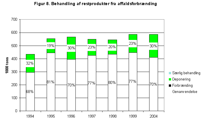Kilde: Se tabel 1 og 2. Figuren er konstrueret sådan, at mængden i år 2004 er den samme som i 1999. Dette skal ikke ses som et udtryk for en prognose om den fremtidige udvikling i affaldsmængderne.