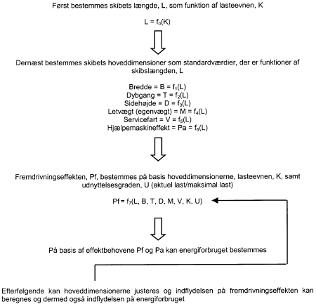Energiforbrug og emissioner fra skibe i farvandene omkring Danmark 1995/96 og 1999/2000 9. Beregninger og resultater9.1 Beregningsmodel TEMA 2000l maj 2000 offentliggjorde Trafikministeriet den såkaldte TEMA 2000 model, som er et beregningsværkstøj til bestemmelse af energiforbrug og emissioner (luftforurening) for transporter i Danmark (TEMA = Transporters EMissioner under Alternative forudsætninger). Modellen kan foretage beregninger for forskellige typer trafik: Bil, tog, fly og skibe. Det er beregningsmetoden for sidstnævnte transportmiddel, der efterfølgende kort vil blive gjort rede for, idet en mere udførlig beskrivelse af den skibstekniske beregningsmetode findes i "TEMA2000 Bilagsrapport 2 Beskrivelse af det skibstekniske beregningsgrundlag, Udarbejdet af Hans Otto Kristensen". 9.1.1 SkibstyperDen skibstekniske beregningsmodel er udviklet for følgende skibstyper og -størrelser: Containerskibe: 100 - 7000 TEU (TEU = standardcontainer med en længde på 20 fod) 9.1.2 Beregningsmetode Beregning af energiforbruget for forskellige skibstyper kan i princippet fo9999retages ud fra en tilstrækkelig stor mængde aktuelle olieforbrugsdata for forskellige skibstyper af varierende størrelse, så hver skibstype bliver dækket bedst mulig. Problemet ved en sådan metode er imidlertid, at de opgivne olieforbrugsoplysninger sjældent svarer til helt sammenlignelige driftsforhold. Nogle oplysninger gælder måske for skibe sejlende med fuld last ved en motorydelse på eksempelvis 85% af maksimal ydelse, andre data stammer måske fra et skibs prøvetur, hvor målinger foretages, når hovedmaskineriet yder maksimal effekt, men hvor det aktuelle skib måske ikke er fuldt nedlastet, og atter andre data svarer måske til sejlads under nogle specielle ugunstige vejrforhold, som øger effektbehovet. Alt i alt vil analyse af sådanne olieforbrugsregistreringer være behæftet med en række usikkerhedsfaktorer af ikke uvæsentlig betydning. Der blev derfor for TEMA 2000 udviklet en teoretisk beregningsmodel, der på korrekt vis tager hensyn til nogle af de skitserede usikkerhedsmomenter. For at kunne udvikle en sådan beregningsmodel, blev der for hver skibstype foretaget statistiske analyser af skibenes lasteevne, hoveddimensioner (længde, bredde og dybgang) samt øvrige data, der har indflydelse på fremdrivningseffekten (servicefart og skibets egenvægt). På basis af disse statistiske analyser er sammenhængen mellem de forskellige parametre bestemt for hver skibstype, så beregningsmodellen udfra kravet til lastekapacitet for en bestemt skibstype beregner et sæt repræsentative hoveddimensioner inklusiv et forslag til servicefart, der for alle skibstyper afhænger af skibets størrelse og dermed lasteevnen. Når hoveddimensionerne samt farten er fastlagt, beregner programmet den nødvendige fremdrivningseffekt ved hjælp af nogle forskellige empiriske metoder. Disse beregningsmetoders nøjagtighed er blevet vurderet ved at sammenligne beregningsresultaterne fra metoderne med fuldskalamålinger/observationer for nogle udvalgte skibe, hvor der findes dokumenterede fuldskalamålinger. Disse sammenligninger har vist, at de anvendte empiriske beregningsmetoder er rimeligt pålidelige, og at den benyttede beregningsmetodik er væsentlig mere nøjagtig end indsmaling og analyse af olieforbrugsdata. De af programmet foreslåede hoveddimensioner kan ændres individuelt, så man kan se, hvilken indflydelse de pågældende parametre har på fremdrivningseffekten. Til brug for udviklingen af TEMA-modellen er der dog kun benyttet de statistisk bestemte standardværdier. Strukturen i beregningsmodellen er vist i nedenstående figur, hvoraf det tydeligt fremgår hvilke parametre, der indgår i beregningerne. Figur 1.