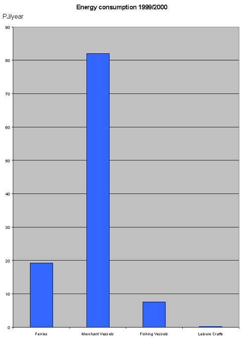 Energy consumption and emissions from shipping in the waters surrounding Denmark 1999/2000 The following table shows the total energy consumption and emissions from ships operating in the waters surrounding Denmark. 1999/2000