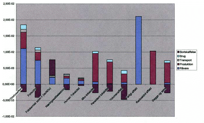 Figur 8: Miljøprofil for genbrugsbæger 1 (PP) ved triptal 1, stationær vask og forbrænding ved bortskaffelse.