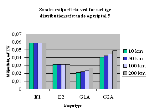 Samlet miljøeffekt ved forskellige distributionsafstande og triptal 5.