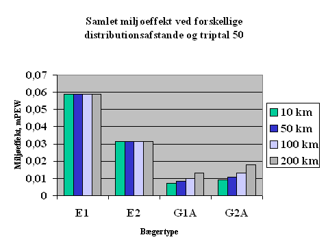 Samlet miljøeffekt ved forskellige distributionsafstande og triptal 50.