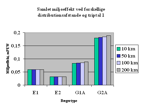Samlet miljøeffekt ved forskellig distributionsafstande og triptal 1.