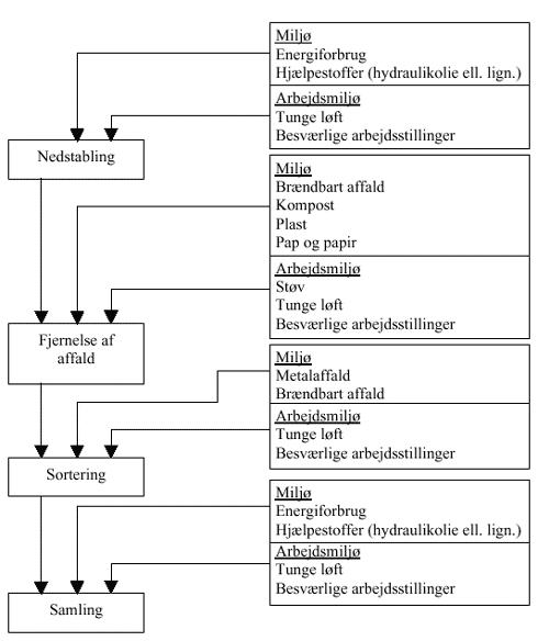 7.2.4 SamlingCC-containere samles typisk med 5-8 hylder. Øverste hylde placeres ca. 1,8 m over gulv. I dag (scenarie 1) sker samlingen manuelt. I forbindelse med vurderingen af scenarie 2 (depotkoncept) er det forudsat at samlingen sker automatisk. Det antages, at transport af bundrammer til / fra arbejdsfunktioner sker manuelt ved at bundrammen skubbes i foroverbøjet stilling. 7.2.5 GenereltDet antages, at automater og transportbånd er korrekt afskærmet. For at minimere arbejdsrisici i forbindelse med håndtering af ukurante og dårlige containere, som falder sammen, er det antaget, at der sker en frasortering af containere og containerdele. 7.3 AfgrænsningerMiljøvurderingen af håndteringen af CC-containere på depoter er afgrænset til primært at omfatte de parametre, som fremgår af figur 4.1. Figur 4.1