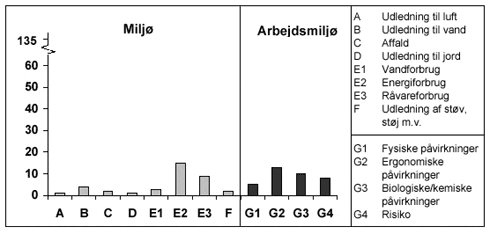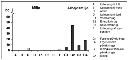 Hver påvirkning vurderes for sig under mængde, spredning og effekt. Under den enkelte kategori kan der være foretaget en vurdering af en række forskellige påvirkninger, eksempelvis under kategorien G2 Ergonomiske forhold, som bl.a. omfatter tunge løft, samlet løftet vægt, vrid i kroppen, højt og lavt arbejde m.v. Hver af disse påvirkninger får tildelt et point for hhv. mængde, spredning og effekt. For at opnå det samlede pointtal for kategorien (eks. G2 Ergonomiske forhold) ganges de 3 tildelte point (for mængde, spredning og effekt) sammen. Det samlede pointtal udregnes for hver af arbejdsprocesserne for håndtering af CC-containere (nedstabling, fjernelse af affald, sortering og samling). Hvert pointtal sættes ind i en matrix, hvor den totale score udregnes for hver kategori ved at pointtallene for hver proces lægges sammen under de enkelte kategorier (se figur 4.2). Figur 4.2 Se her! Den totale score indsættes i figuren "Væsentlige miljø- og arbejdsmiljøpåvirkninger" (figur 4.3) under de enkelte påvirkninger. Figur 4.3