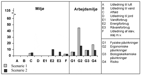 I det nedenstående er beskrevet, hvilke påvirkninger, der er i de forskellige kategorier (A G4), og hvad der ligger til grund for vurderingen af de enkelte kategorier. Miljø Der henvises til scenarie 1, afsnit C Affald, side 45. Ved anvendelse af CC-hyldedispenseren forbruges der elektricitet. Vurderingen er foretaget ud fra, at CC-hyldedispenseren har et årligt elforbrug på mindre end 3.500 kWh, hvilket svarer til en årlig udledning af CO2 på mindre end 1 ton, NOX på mindre end 2,4 kg og SO2 på mindre end 7,1 kg. Ved drift af CC-hyldedispenseren anvendes der forskellige hjælpestoffer eksempelvis hydraulikolie, smøremiddel m.v. Arbejdsmiljø Der henvises til scenarie 1, afsnit G1 Fysiske påvirkninger, side 45. Tungt arbejde / vrid i kroppen Nedstabling af bundrammer sker automatisk, hvilket har gjort at en væsentlig mængde tungt arbejde er fjernet. Herudover er en betydelig mængde vrid i kroppen kombineret med en vægtpåvirkning fjernet. Den samlede manuelt løftede vægt pr. dag er mindsket betydeligt grundet begge de nævnte nedstablingsmetoder. Der opstår tungt arbejde ved fjernelse af affald, såfremt dette sker ved at ryste eller banke enkeltdele rene, idet disse herved løftes eller tippes. Nedstabling af hylder sker med CC-hyldedispenser. Dette gør, at en mængde højt arbejde samt vrid i kroppen er fjernet. Der kan opstå besværlige arbejdsstillinger i form af lavt arbejde ved frigørelse og fjernelse af fastlåste hylder fra bunden af stabelsættet. Ved fjernelse af affald på containernes hylder i form af fejning, kan der opstå lavt arbejde, såfremt der ikke anvendes en kost med passende lang skaft. Der opstår besværlige løft i form af løft under lårhøjde med vrid i kroppen, når defekte hylder tages fra transportbåndet. Samling af containere sker med CC-hyldedispenser. Dette gør, at en mængde højt/lavt arbejde samt vrid i kroppen er fjernet. Desuden er den samlede manuelt løftede vægt pr. dag mindsket betydeligt. Ved fjernelse af affald opstår der vrid i kroppen, når man ryster eller banker hylder og bundrammer rene. G3 Biologiske / kemiske forhold Fjernelse af affald Der henvises til scenarie 1, afsnit G3 Biologiske/kemiske forhold, Støv, side 46. Der opstår risiko for at vælte stabelsæt under manuel transport (træk / skub) af containere på ujævnt eller skråt underlag. Et standard stabelsæt vejer ca. 230 kg. 7.6 DiskussionVed at udvide Container Centralens genbrugscontainersystem med et depotkoncept vil man opnå en væsentlig reduktion af arbejdsmiljøpåvirkningerne ved håndtering af CC-containere på depoter, men samtidig vil der fremkomme en mindre stigning i miljøpåvirkningerne (se figur 4.6). Figur 4.6