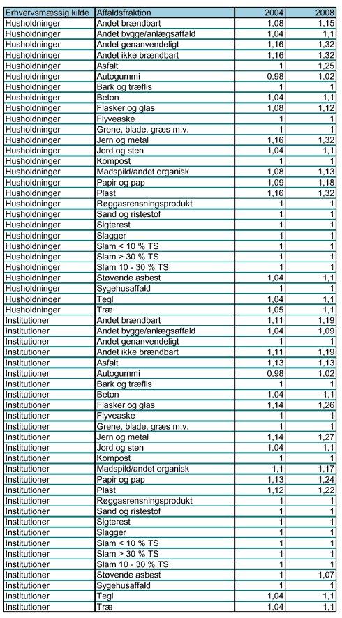 kilde og affaldsfraktion, der er beregnet af Risø-modellen. For en del kombinationer