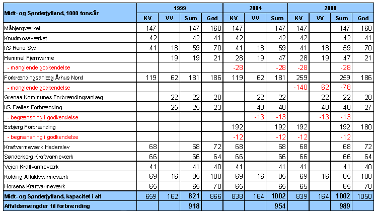 Tabel 33 Mængder og kapaciteter til affaldsforbrænding, Midt- og Sønderjylland