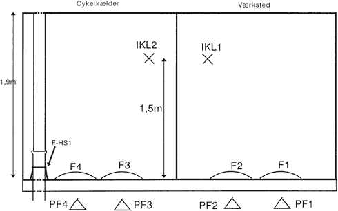 Principskitse, placering af fluxmålinger (F1-F4), indeklimamålinger (IKL1-IKL2),