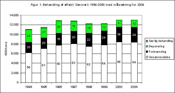 ![]() Kilde: Som tabel 1. Bemærk, at figuren er konstrueret sådan, at den samlede affaldsmængde i år 2004 svarer til affaldsmængden i 2000. Dette er ikke et udtryk for en prognose om udviklingen i de samlede affaldsmængder.