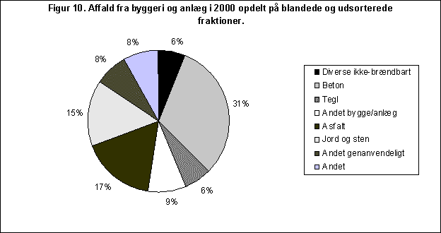 Figur 10 Affald fra byggeri og anlæg i 2000 opdelt på blandede og udsorterede fraktioner.
