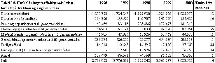 Tabel 15 Husholdningers affaldsproduktion fordelt på fraktion og angivet i tons.