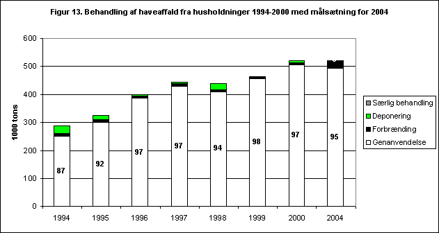 Figur 13 Behandling af haveaffald fra husholdninger 1994-2000 med målsætning for